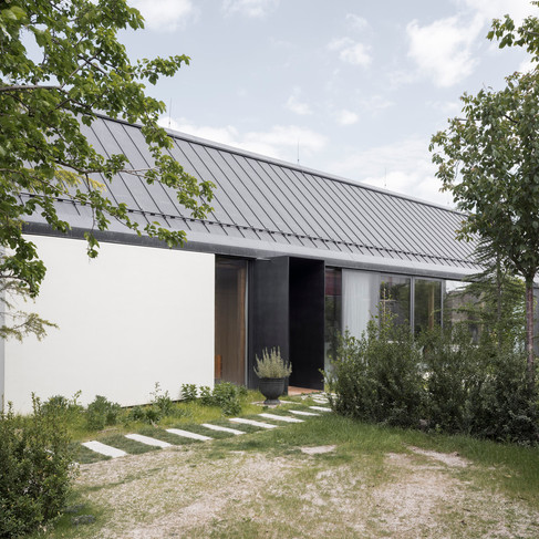 Rafinované riešenie krovu predstavuje najvýraznejší prvok tejto realizácie. Umožnilo presvetliť interiér východným svetlom skrz svetlíky a zároveň nenarušiť súvislú hmotu strechy viditeľnú zo záhrady.